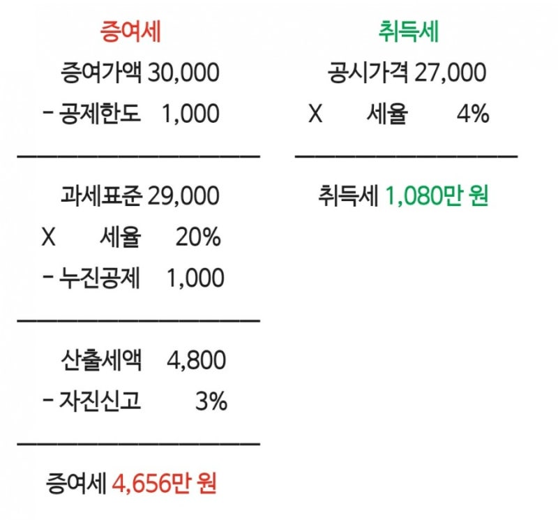 만약 증여세 과세표준이 1,000만원일 경우 1억원x10%=1억원의 증여세가 산출되며 누진공제액은 없습니다.증여세 과세표준이 5천만원인 경우는 1천만원x20%-3억원(누진공제액)=3억원의 증여세가 산출됩니다.그렇다면 증여세 과세표준은 어떻게 계산될까요?