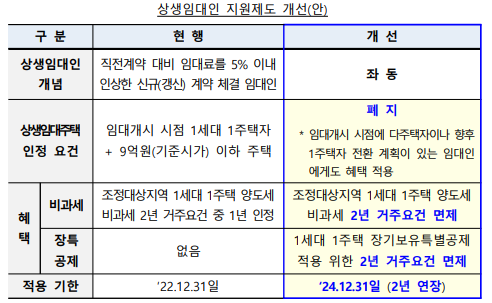 구분기존개량개념임대료가 이전 계약 대비 5% 이하 인상된 신규(갱신)계약임대인 인정요건임대개시 당시 1가구 1주택+주택폐쇄가 9억원(시가표준액) 이하 (임대개시 당시 여러 주택을 소유하고 있거나 향후 1주택으로 전환할 계획이 있는 임대인에게 적용되는 혜택)혜택세액감면조정대상지역 내 1가구 1주택 양도시 2년 거주요건 1년조정대상지역 내 1가구 1주택 양도시 세액감면2년 거주요건 면제장기보유 특별공제 없음1가구 1주택 장기보유 특별공제 적용 시 2년 거주요건 면제신청기한2022년 12월 31일2024년 12월 31일(2년 연장)