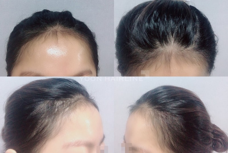 수술 전 수술 전 상태는 보시다시피 전형적인 M자가 쏙 들어 있는 경우였습니다.기본적으로 헤어라인의 절대적인 높이는 높지 않았지만 보시다시피 두개골의 형태가 상당히 남성적이었습니다.이마 골격 자체가 상당히 누워있는 형태였는데 이런 경우 실제 길이보다 이마가 넓어 보이고 탈모가 진행되는 것 같은 느낌을 받습니다.